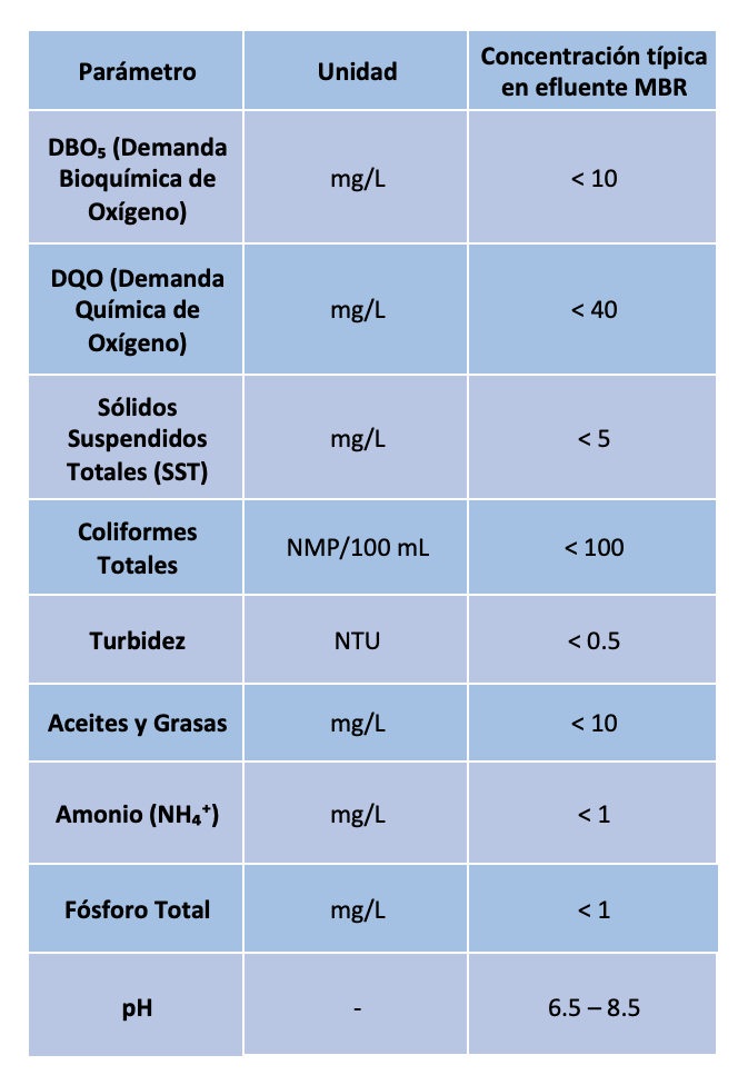 Un MBR bien diseñado y correctamente operado puede mantener una eficiencia de remoción superior al 95 % en DBO, DQO y SST, garantizando un efluente estable y de calidad constante.